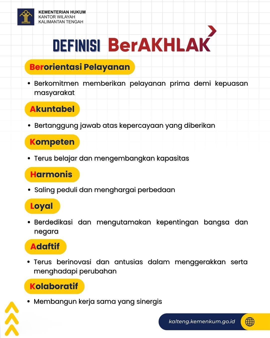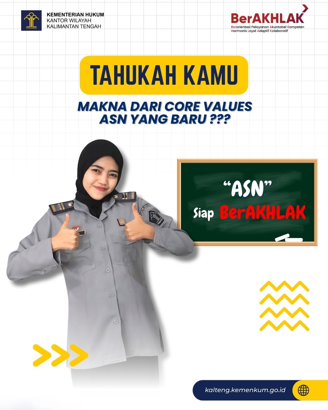 BerAKHLAK merupakan nilai dasar atau core value ASN. BerAKHLAK merupakan singkatan dari Berorientasi Pelayanan, Akuntabel, Kompeten, Harmonis, Loyal, Adaptif, dan Kolaboratif.